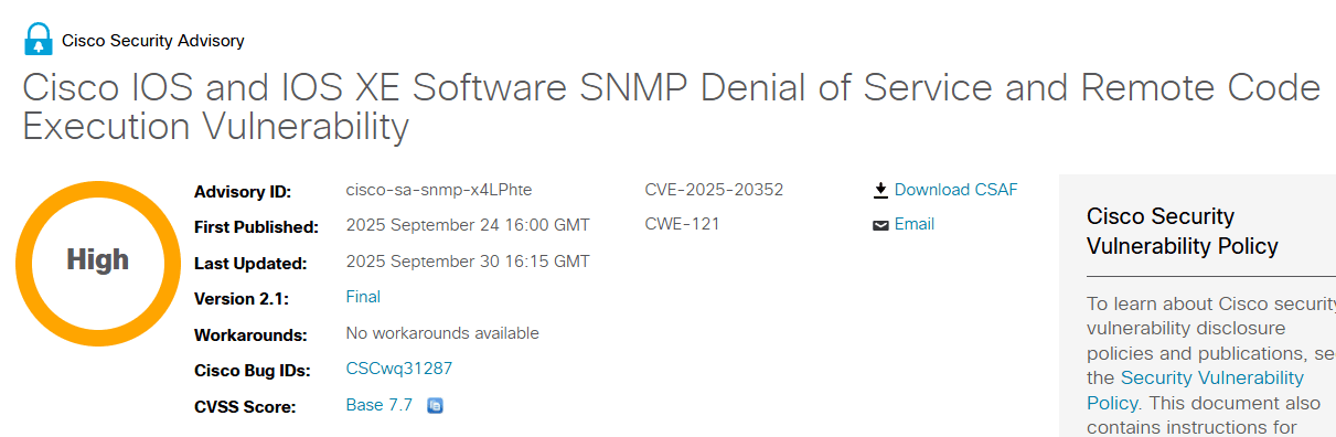 The Cisco IOS SNMP Zero Day (CVE-2025-20352) impacts the SNMP subsystem in Cisco IOS and IOS XE, where crafted SNMP input can trigger unsafe memory handling. The technical details below break down how the flaw is reached in practice and why the outcome differs between disruption and full compromise.