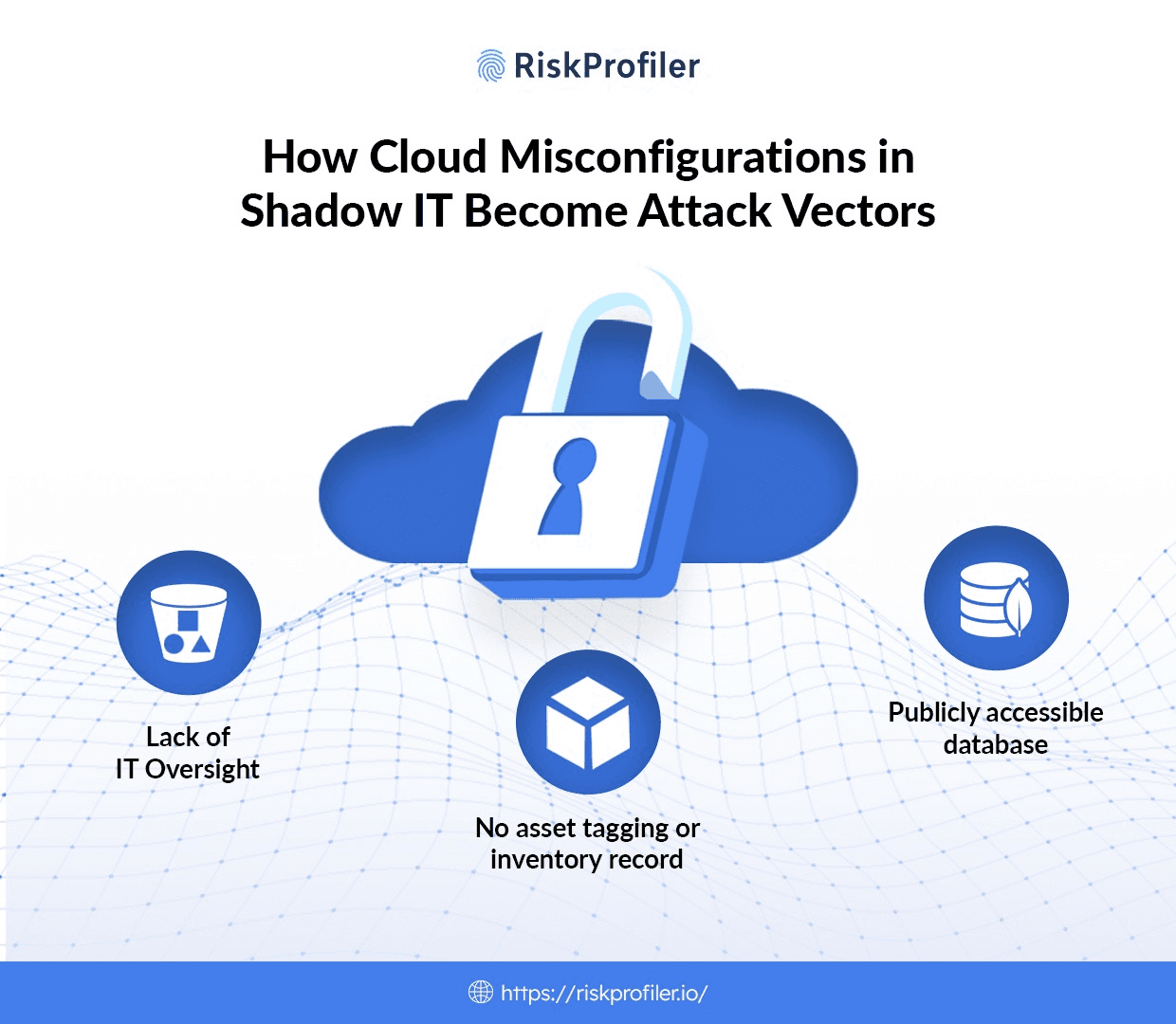 Improperly configured cloud services, like publicly accessible databases or misconfigured storage buckets, are among the most exploited vulnerabilities. As shadow IT assets lie outside the internal IT inventory, the misconfigurations remain undetected for a long time. In the absence of pre-determined asset detection and management workflows, these misconfigured shadow IT assets can be discovered by external threat actors, allowing them access to internal systems.