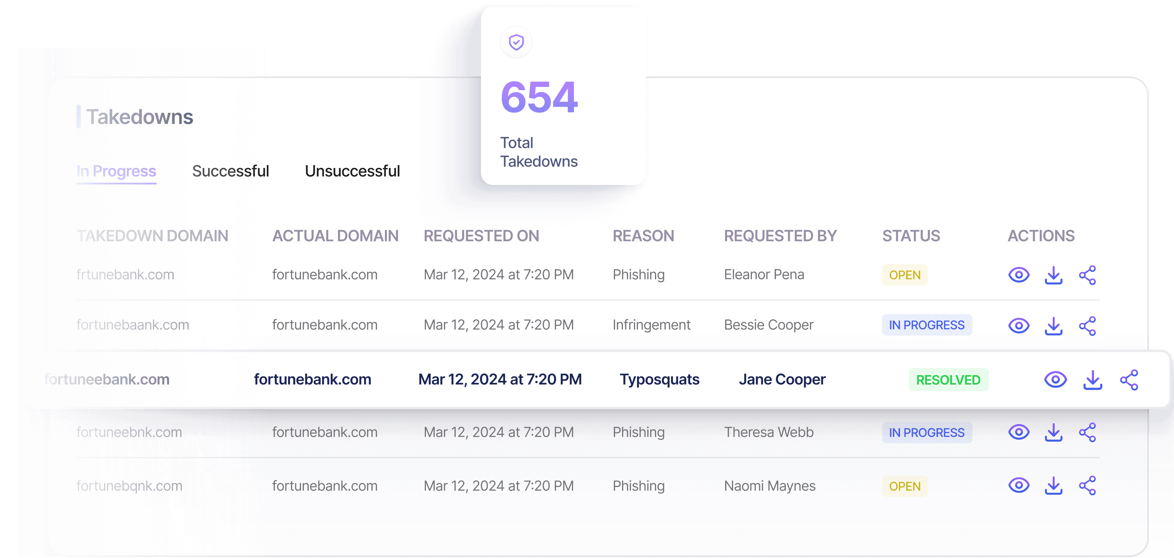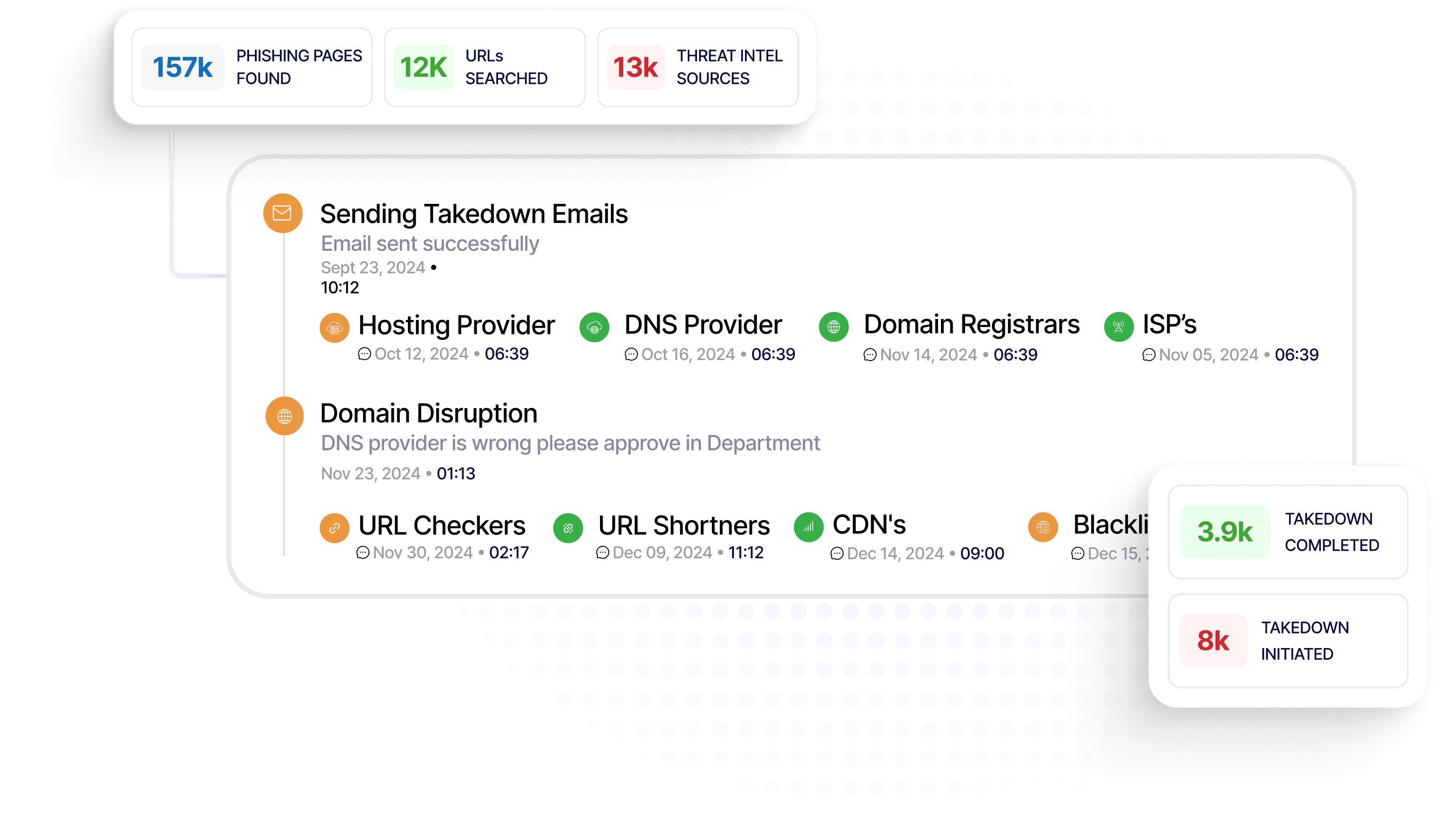 Automated workflows execute take downs across domains, social platforms, and marketplaces, minimizing exposure time and reducing manual burden on security teams.