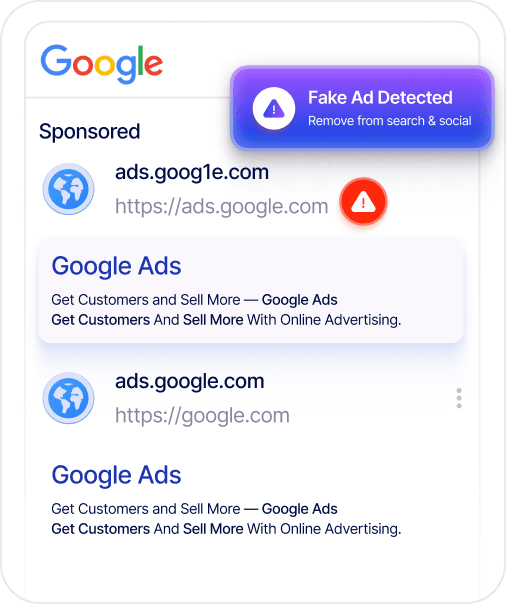 Monitor search engines and paid social networks to identify fake ads impersonating the brand, and remove malicious campaigns to protect your brand reputation.