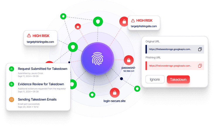 Automated workflows execute take downs across domains, social platforms, and marketplaces, minimizing exposure time and reducing manual burden on security teams