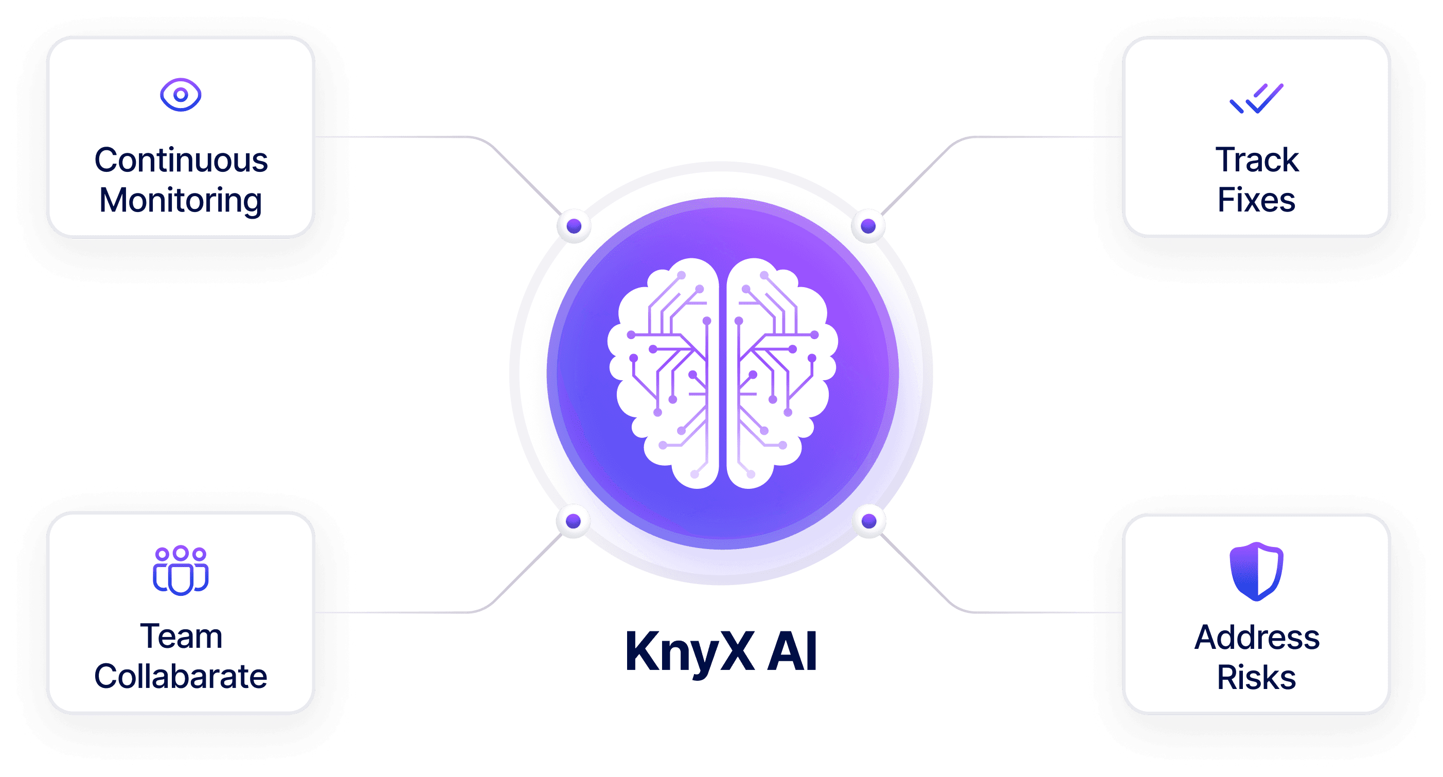 KnyX Vendor AI scans vendor ecosystem constantly, integrating breach data, and compliance status for live risk profiles and policy-driven remediation SLAs.