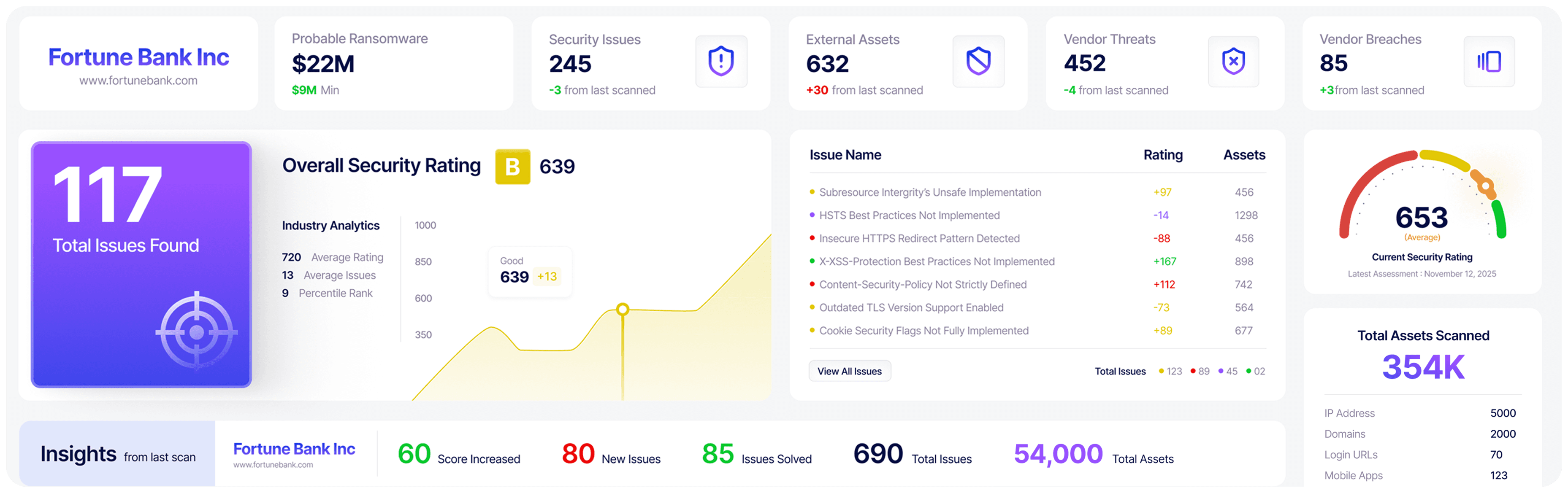 RiskProfiler continuously discovers vendor assets, assigns security ratings, and alerts on exposures in real time, ensuring adaptive vendor risk management at enterprise scale.