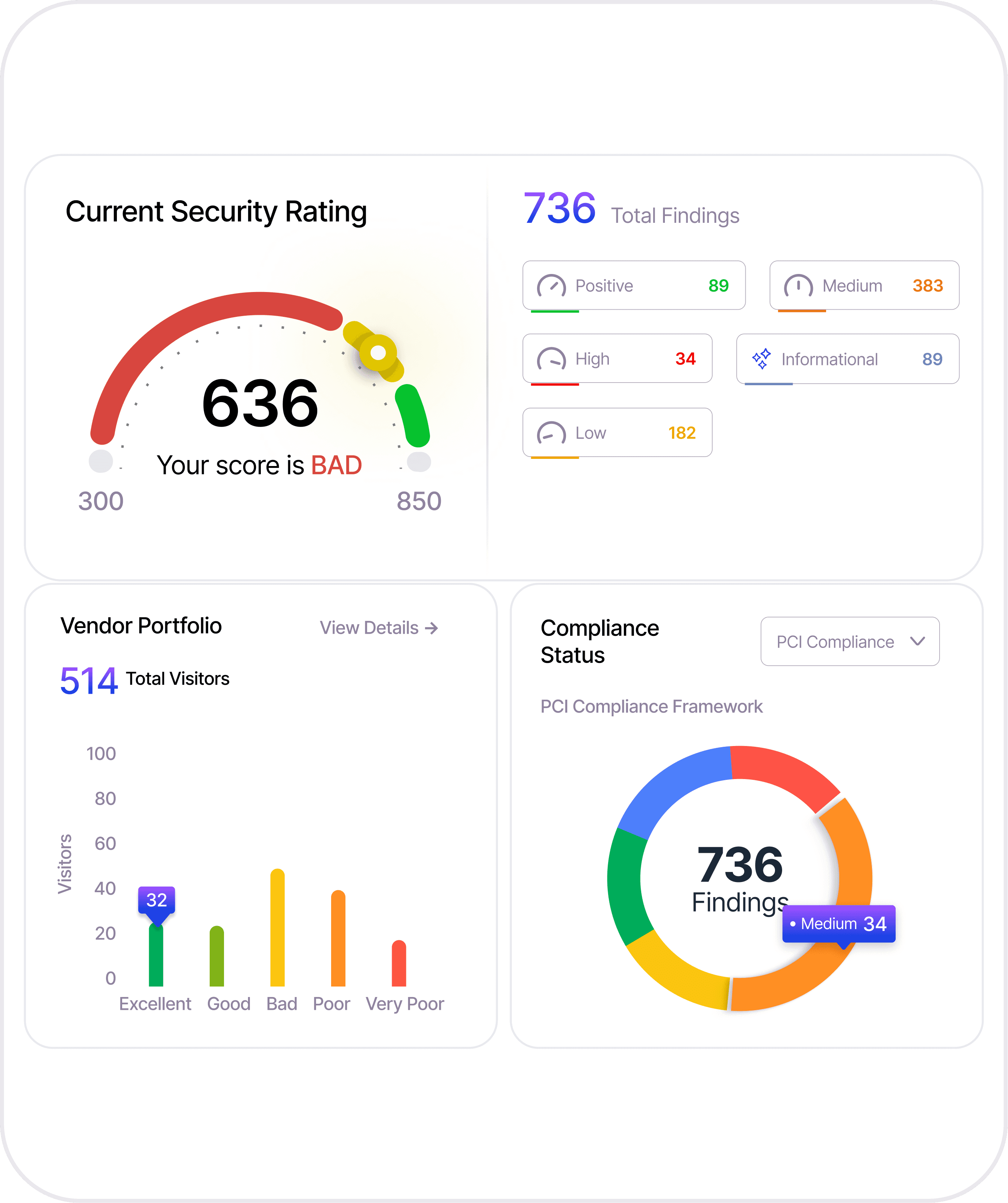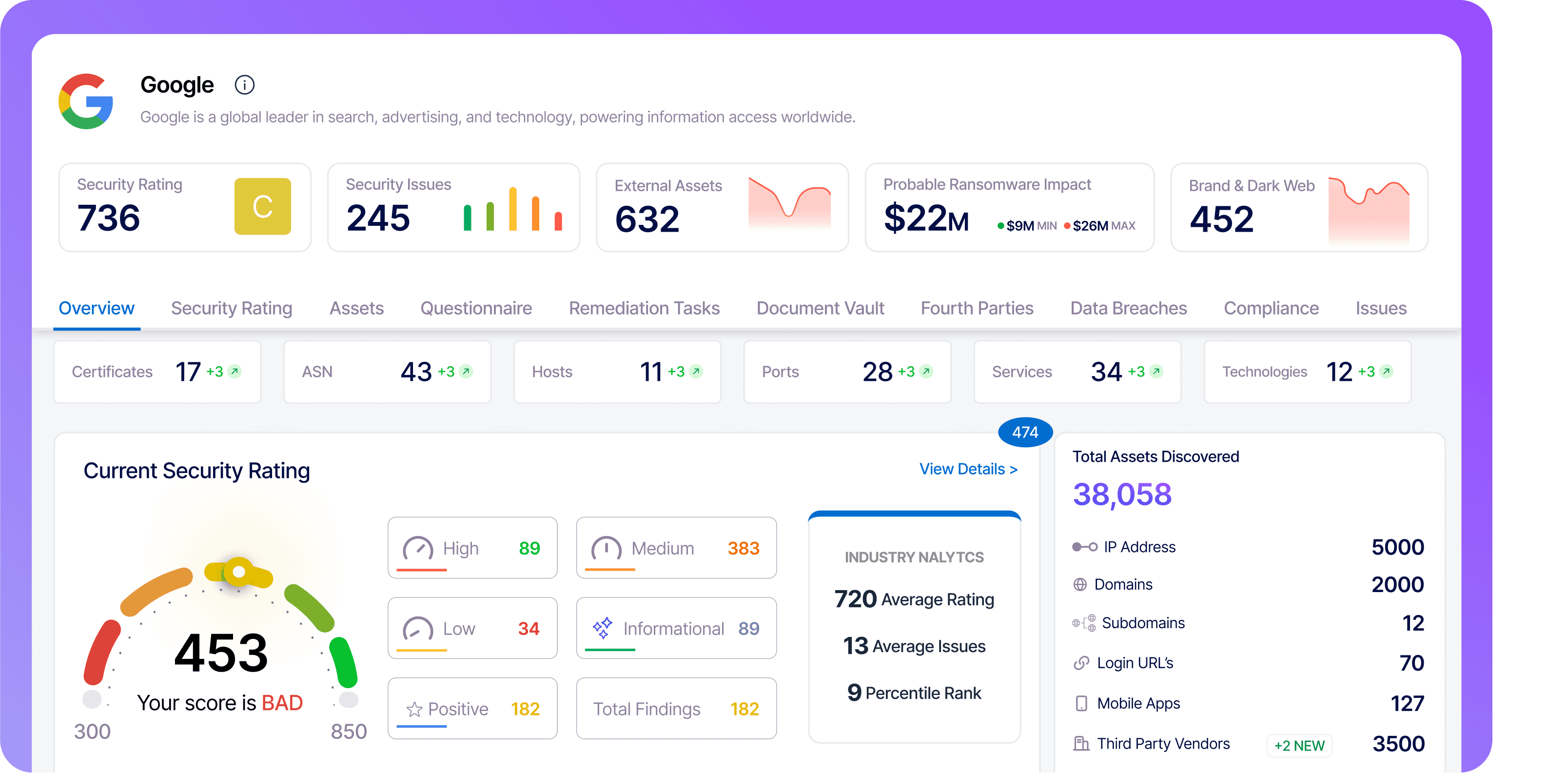 Gain infrastructure-level visibility across supply chain with continuous monitoring, AI-driven security ratings, and historical breach insights.