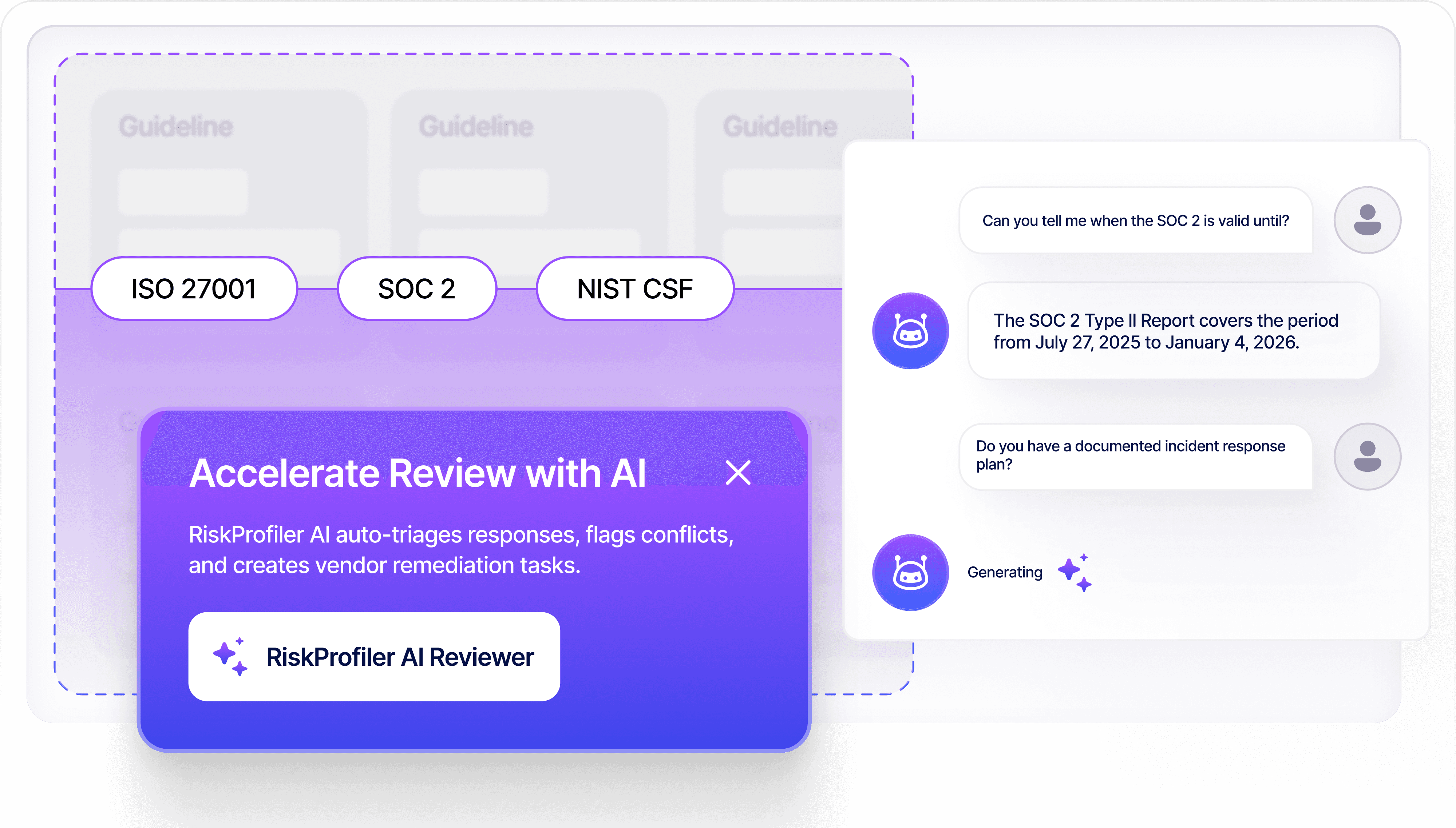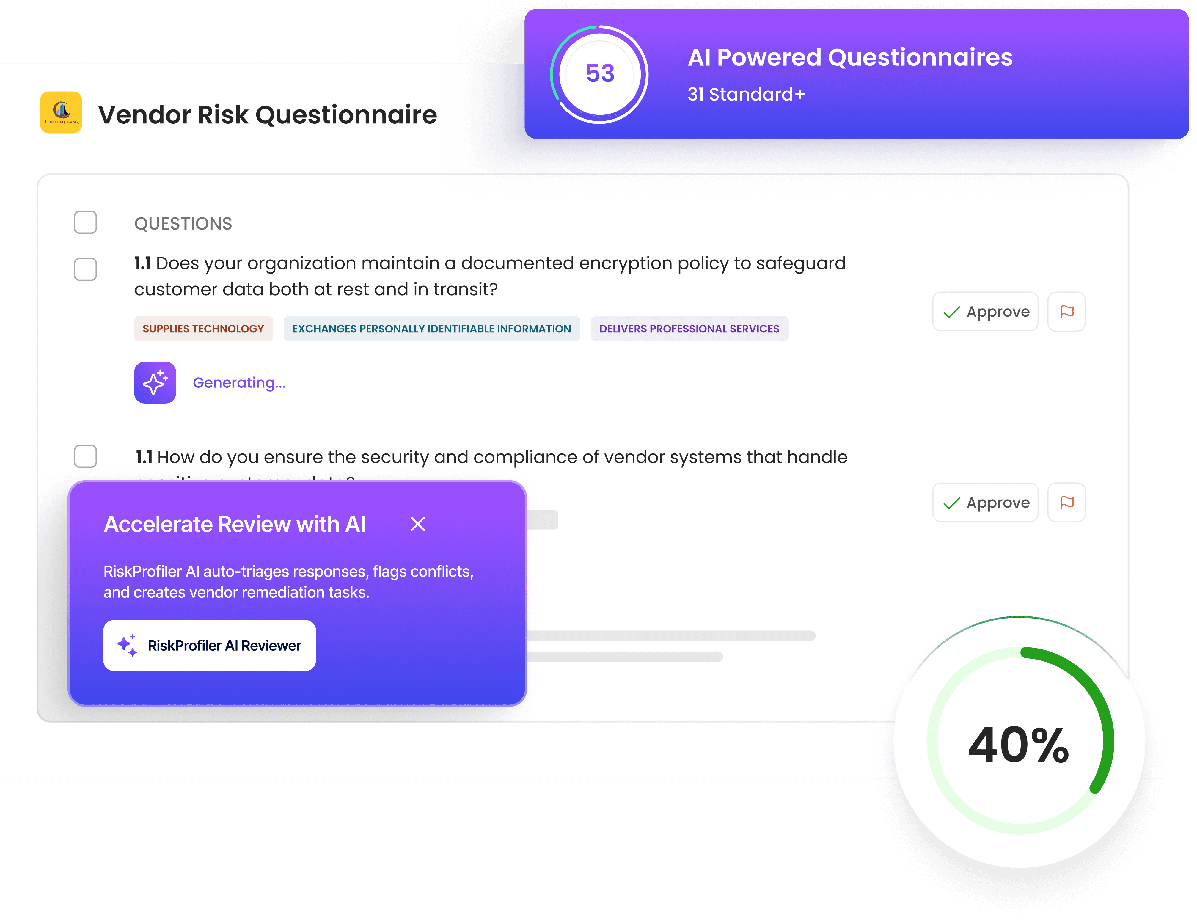 RiskProfiler automates vendor questionnaire distribution using adaptive, AI-powered workflows that route assessments to the right stakeholders without manual follow-ups. Its built-in Trust Center references validated security, compliance, and policy documents to auto-fill responses, accelerate completion, and ensure answers remain aligned with the organization’s latest controls, certifications, and risk posture.
