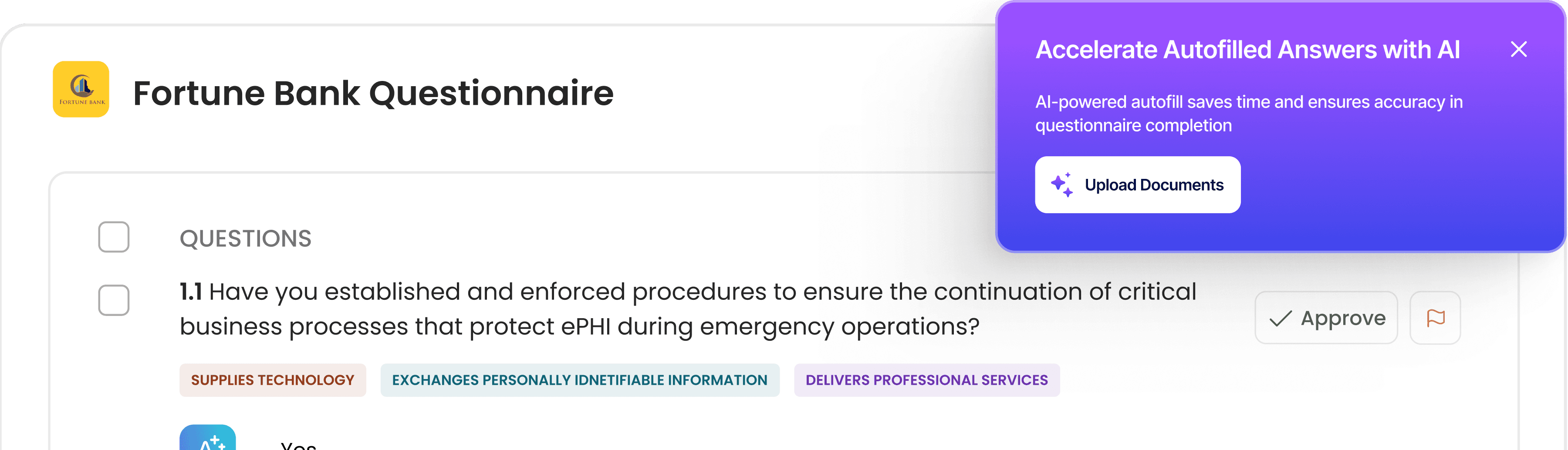 Remove the delays and security gaps of static risk assessments. Accelerate third-party risk evaluations with agentic AI-powered questionnaires for better compliance management and seamless collaboration.