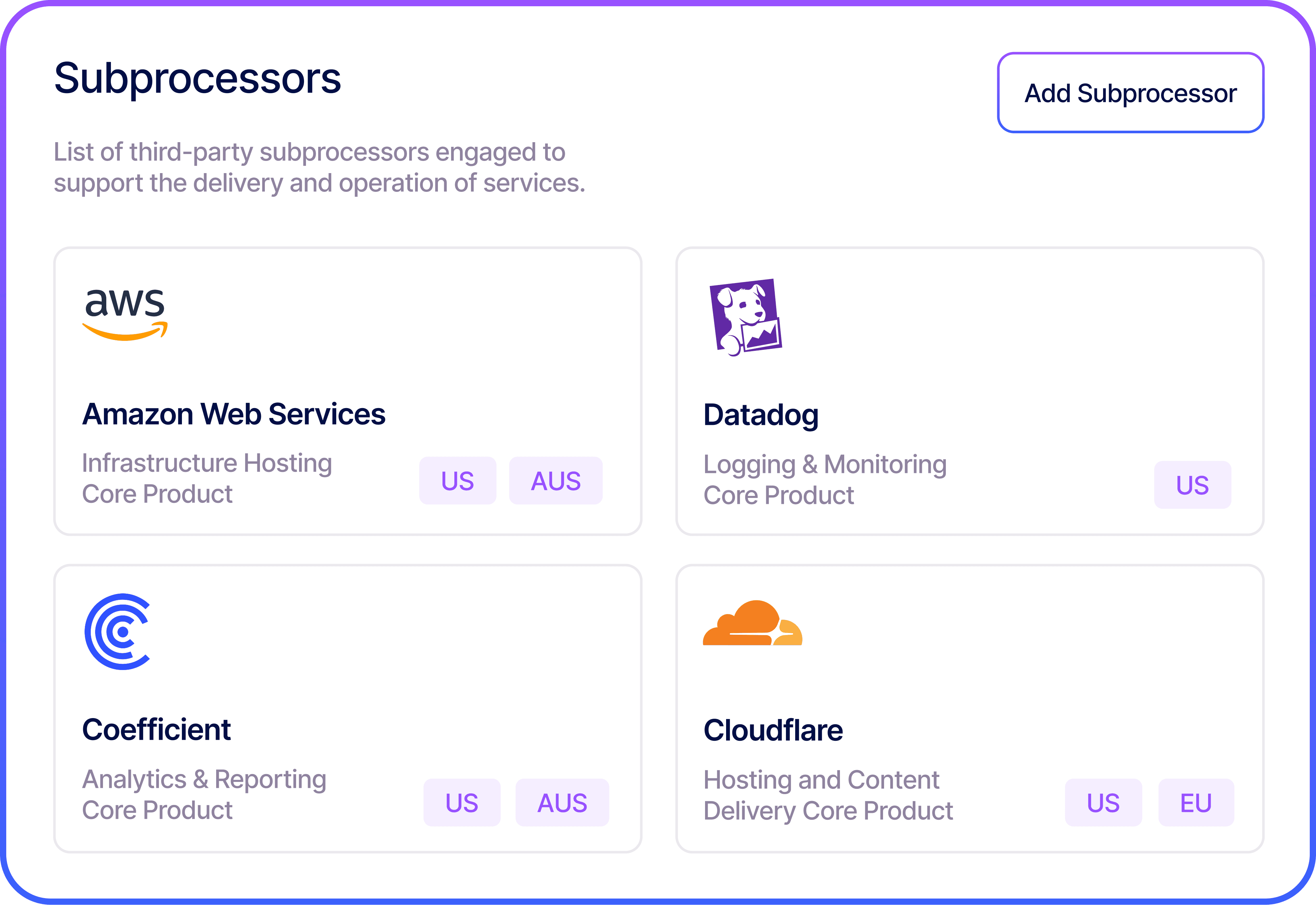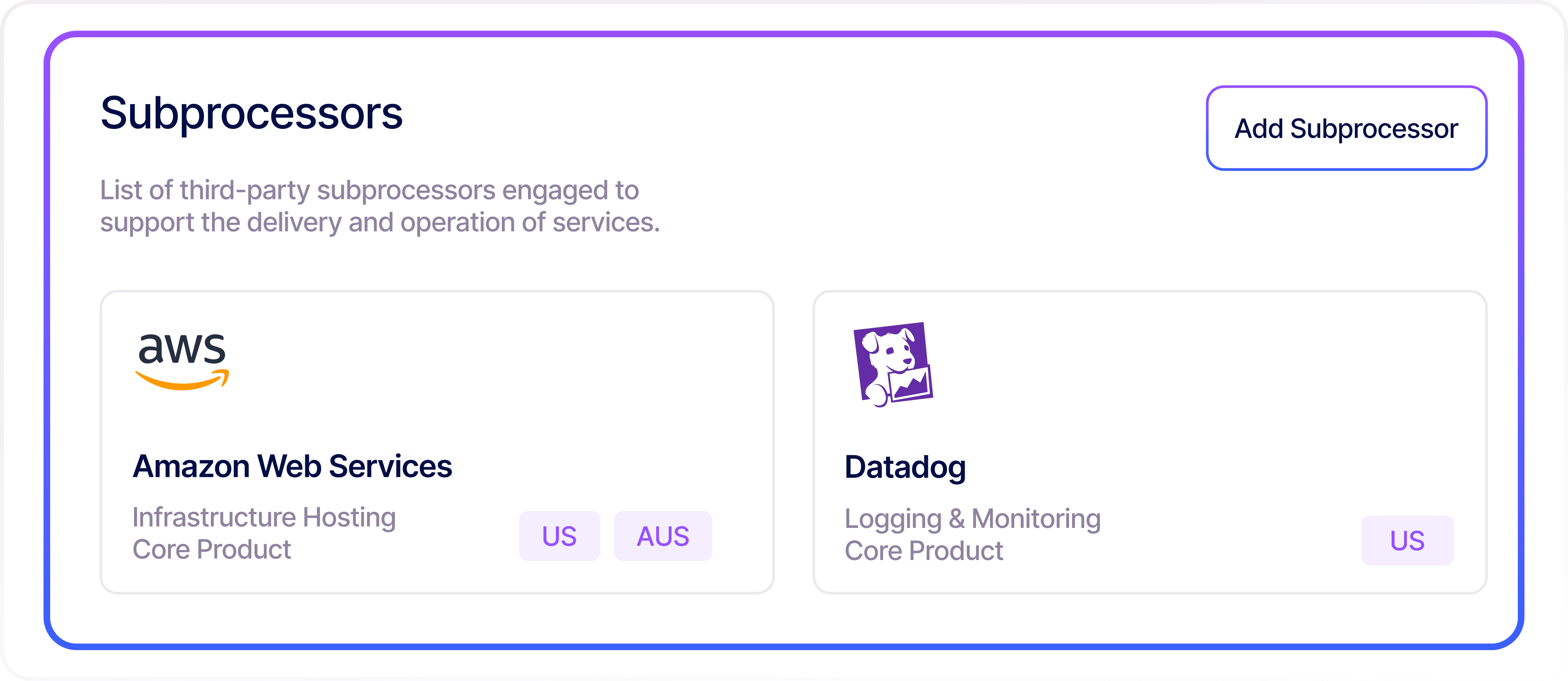 Present an adaptive list of subprocessors to show which third parties process data, improving transparency and visibility.