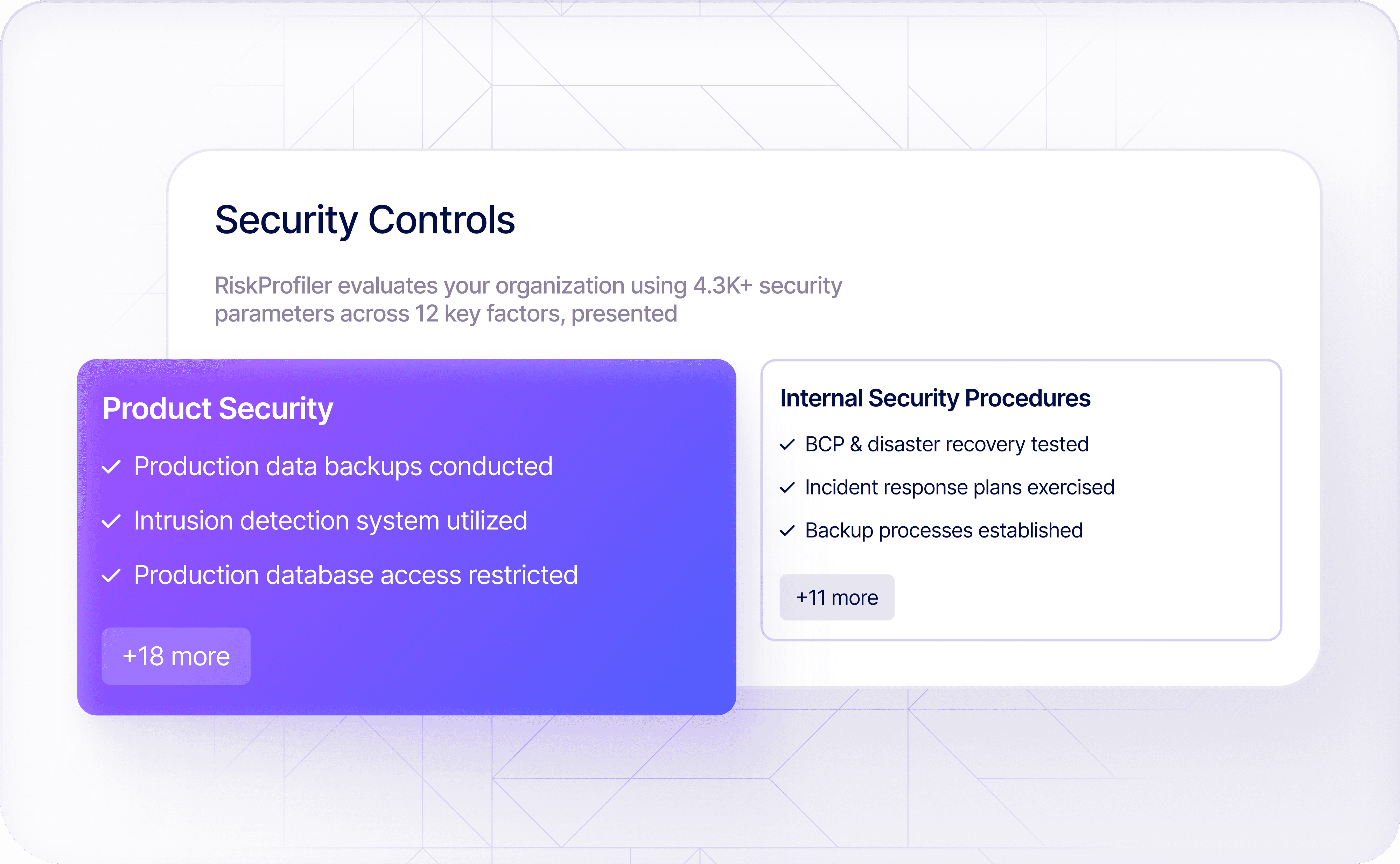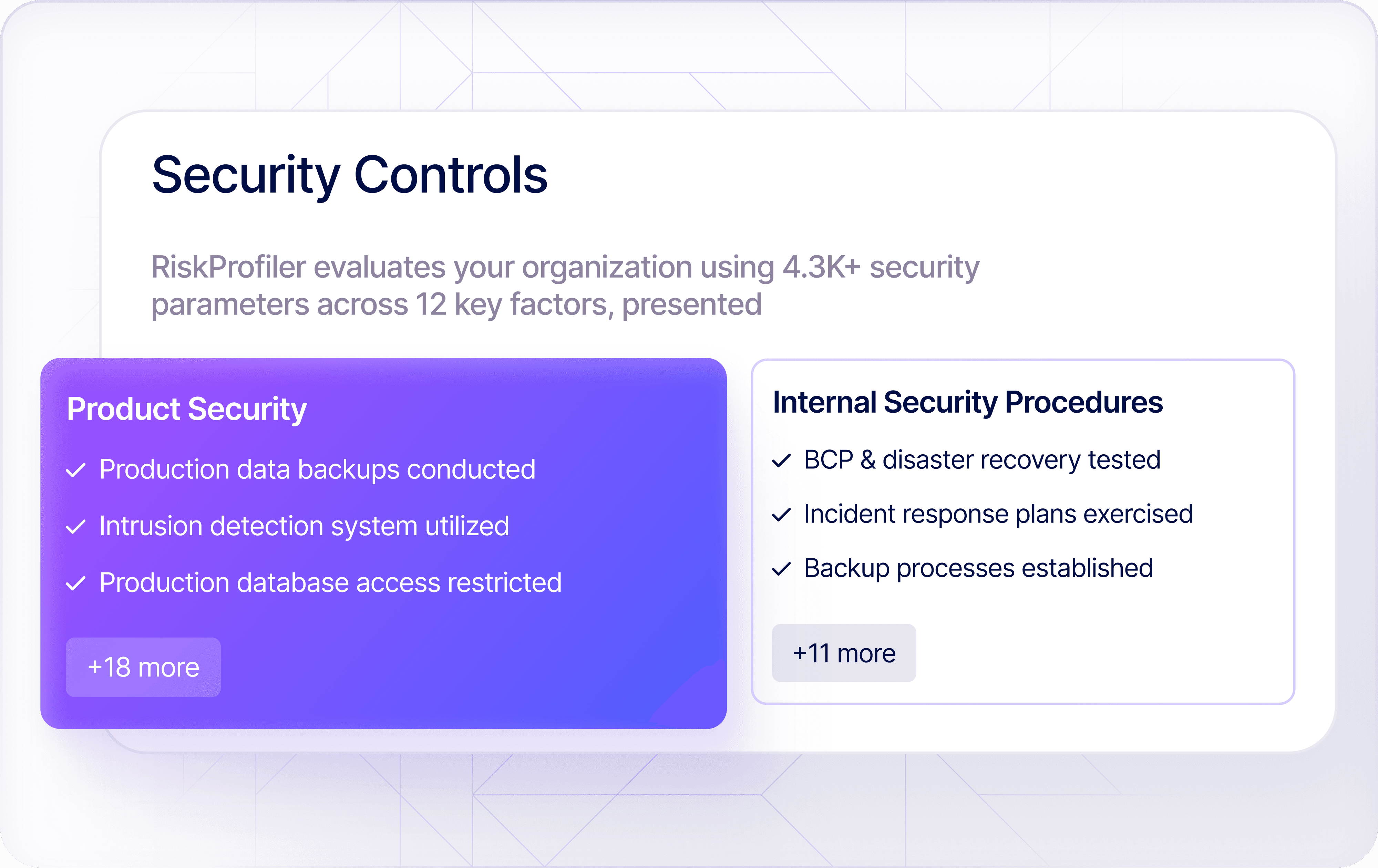 RiskProfiler Trust Center is a secure, self-serve portal that centralizes all security, compliance, and risk documentation required for vendor assessments, enterprise due diligence, and sales reviews. It provides instant access to audit reports, policies, certifications, security controls, and real-time posture insights, reducing back-and-forth requests and accelerating trust with buyers, partners, and stakeholders.