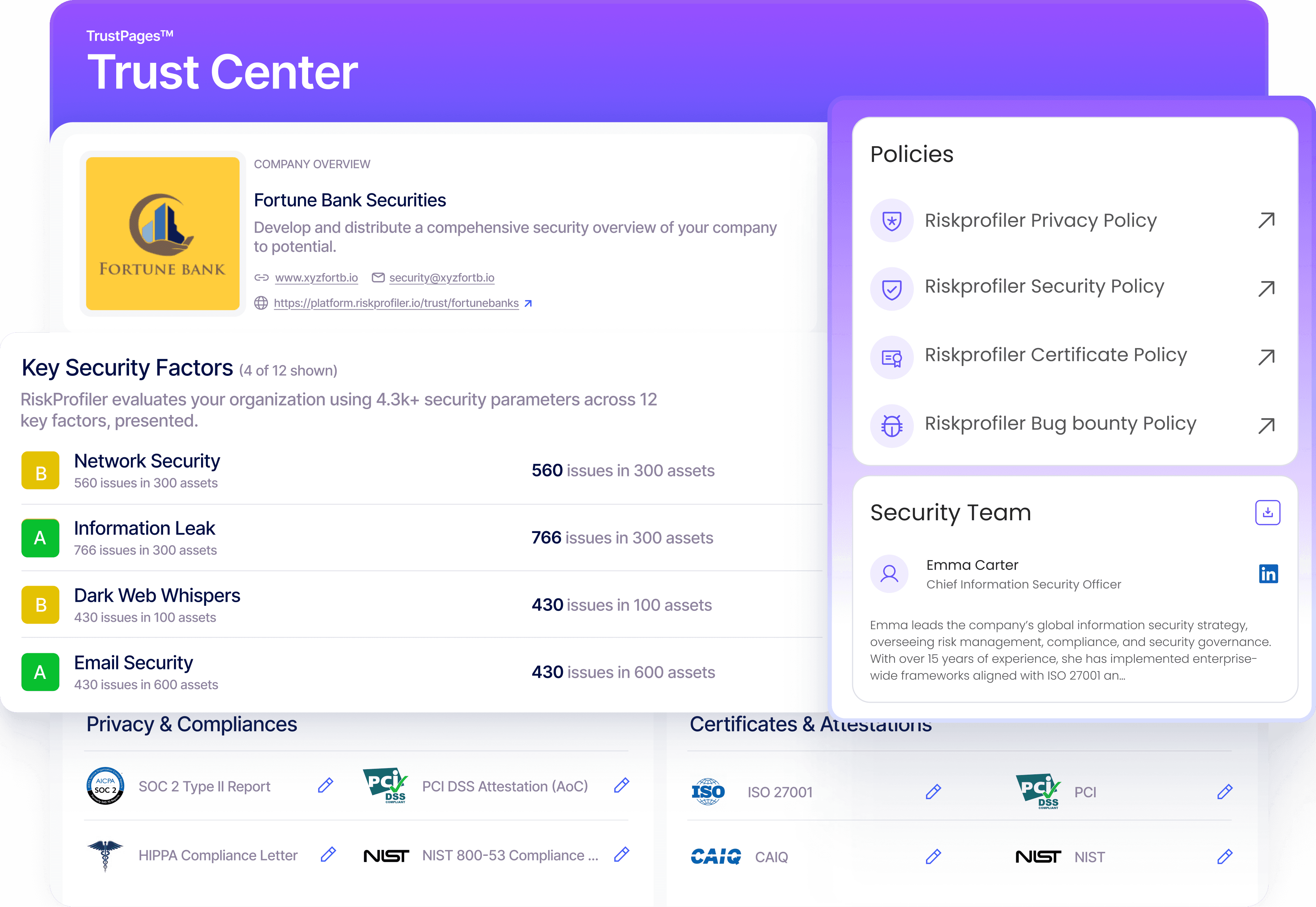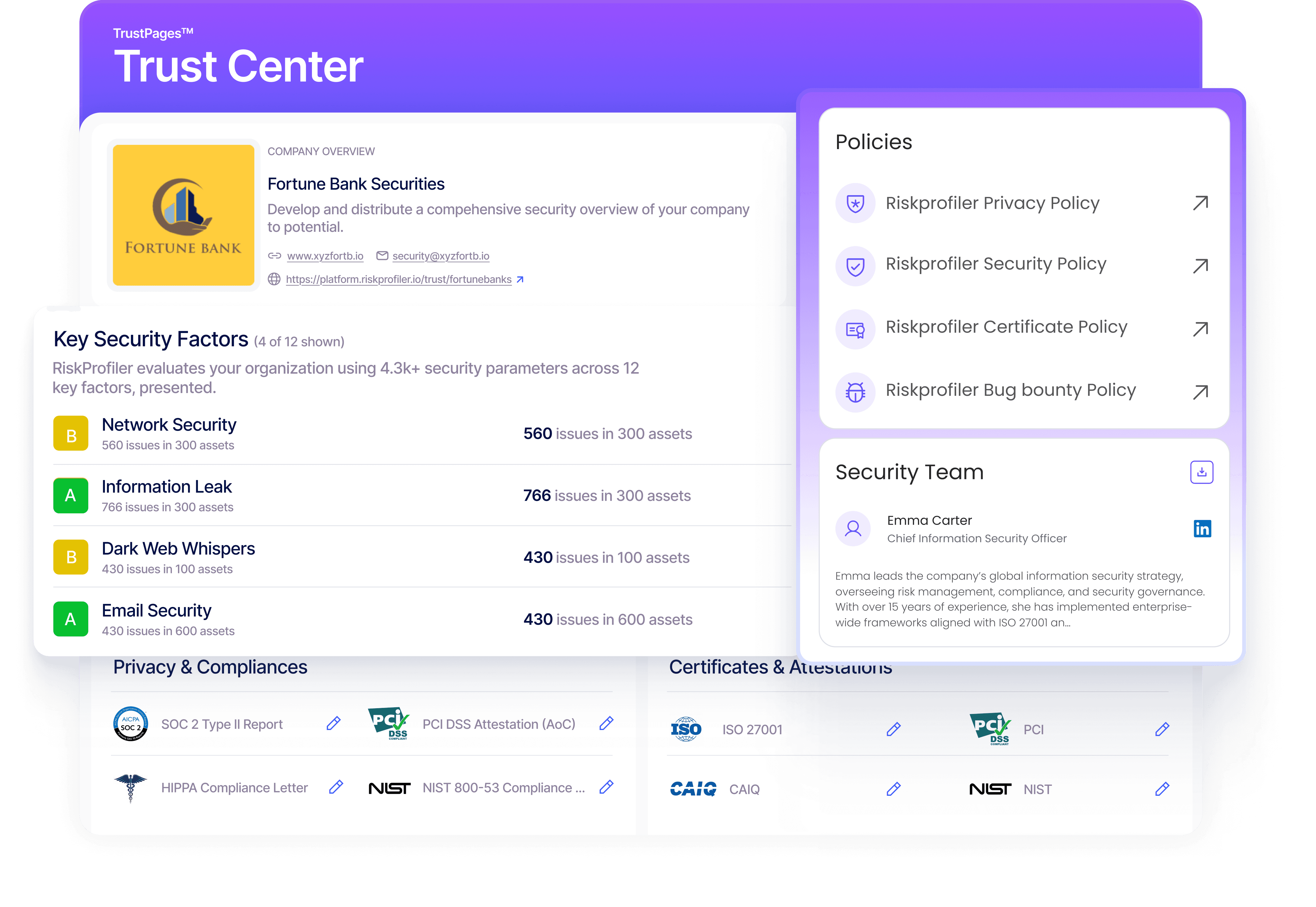 RiskProfiler Trust Center lets you tailor an executive-grade security and compliance narrative, unifying company context, policies, evidence, and certifications into one organized, always up-to-date destination for instant stakeholder clarity.